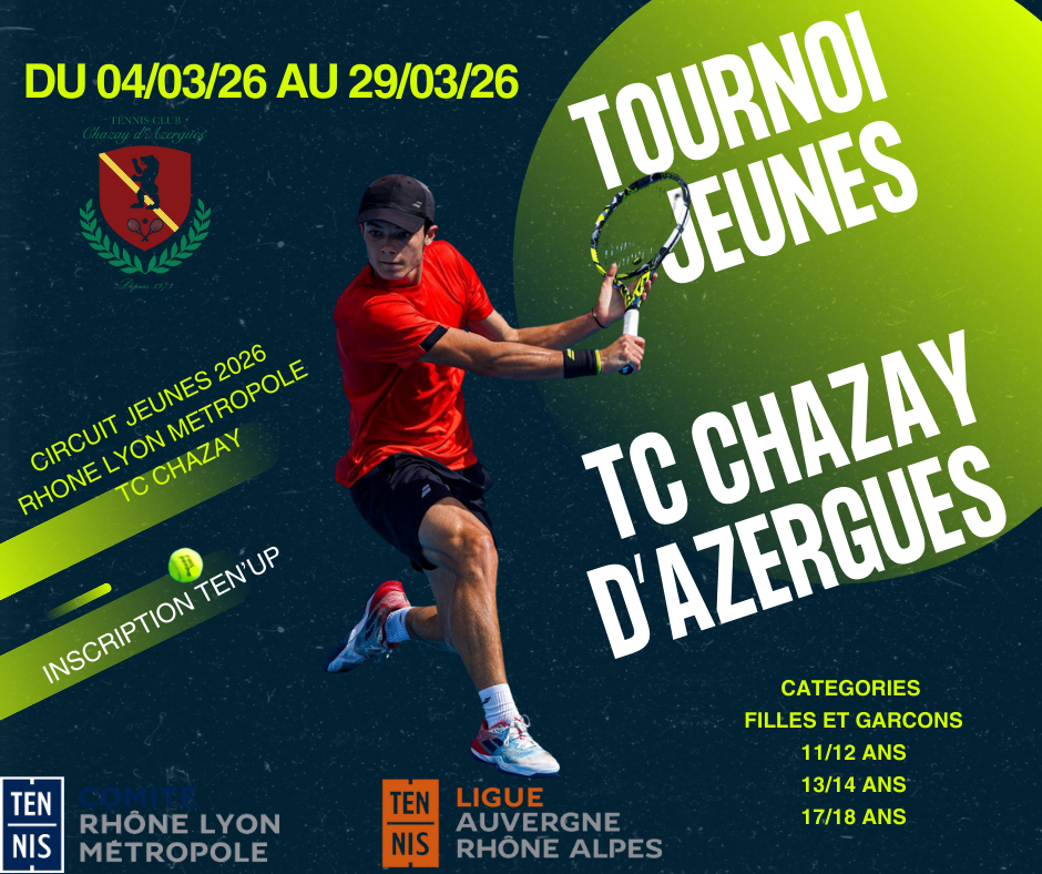 Le tennis club de Chazay organise la 5ème édition de son tournoi jeunes qui se déroulera du 4 mars au 29 mars. Les matchs se joueront principalement les mercredis et week-end.